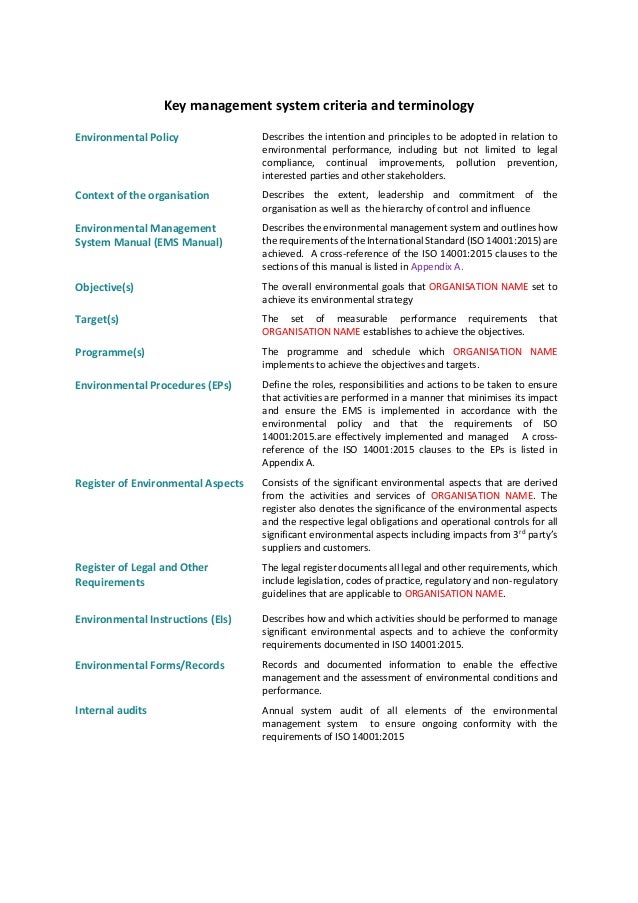 Planning6.1 Risk & Opportunities6.2 Objectives & Targets6.3 EMS Planning6.4 Identification, Assessment & Control (Environmental Aspects)6.5 Compliance Obligations7. Support7.1 Resources7.2 Training & Competency7.3 Awareness7.4 Environmental Communication7.5 Documented Information7.5.1 Creating & Updating7.5.2 Document Control8. Operation8.1 Operational Planning & Control8.2 Emergency Preparedness & Response9. Performance Evaluation9.1 Monitoring, Measurement, Analysis & Evaluation9.1.1 Evaluation of Compliance9.2 Internal Audit9.3 Management Review9.3.1 Review Input9.3.2 Review Output10. Improvement10.1 Non-Conformance & Corrective Action10.2 Continual Improvement Related products.